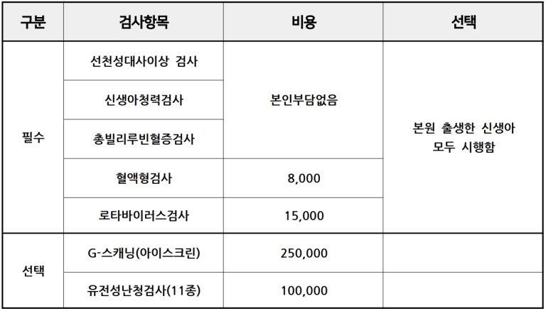 신생아실, 모자동실을 운영하고 있는 본원은 집단감염을 예방하고자 퇴원일에 로타바이러스 간이검사를 모든 신생아에게 시행하고 있습니다. 비급여 검사이며, 비용은 15,000원입니다.